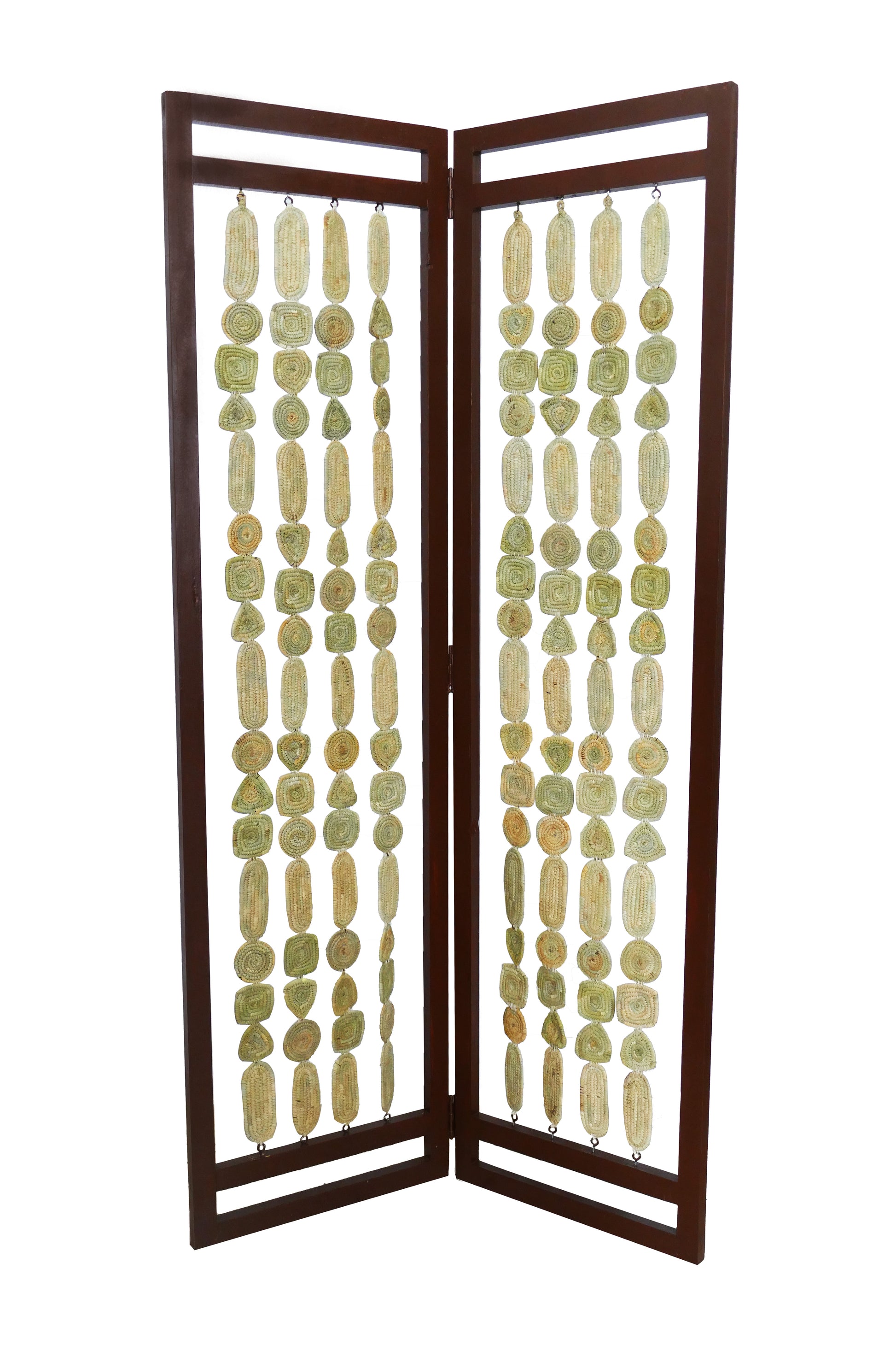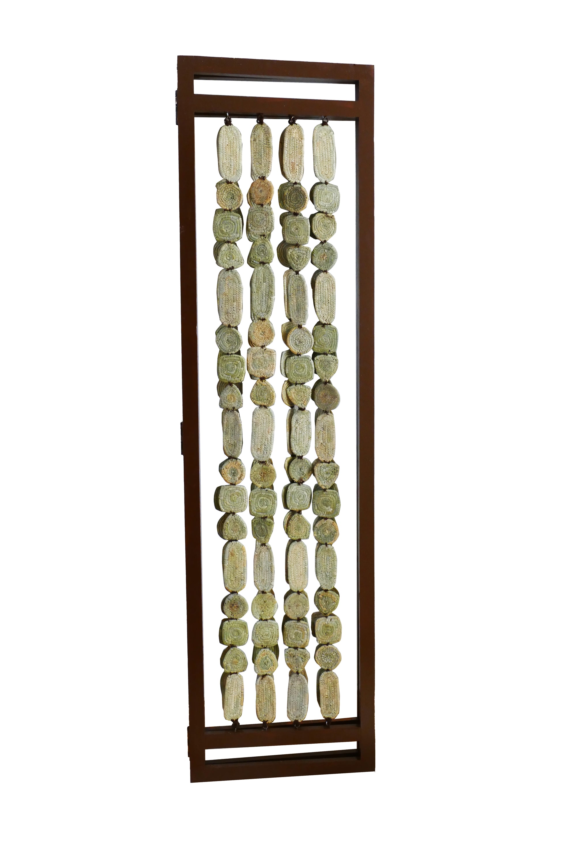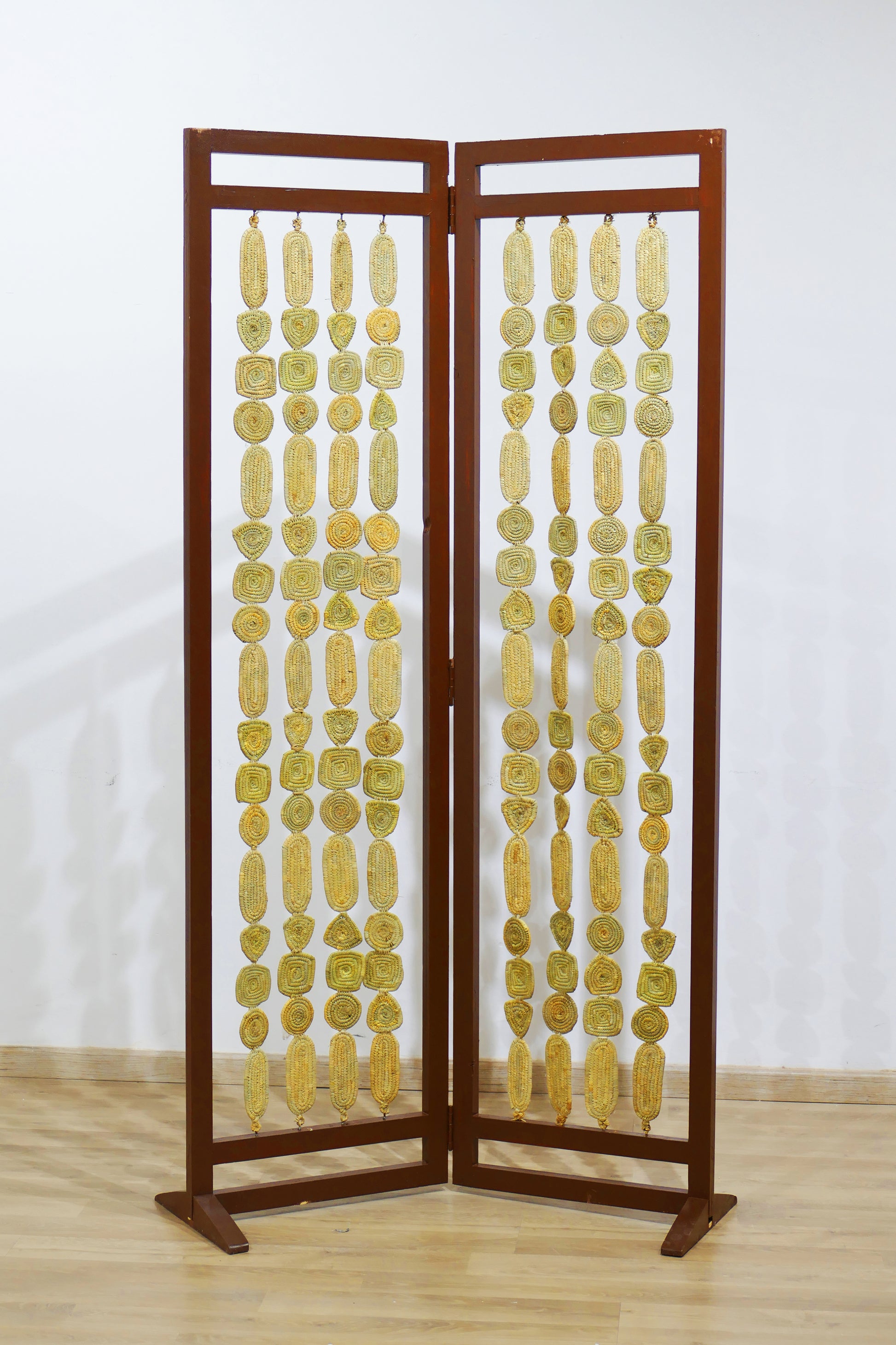 Chaque colonne est composée de petites formes tissées à la main, créant un jeu subtil de lumière et de transparence qui habille vos espaces avec douceur.